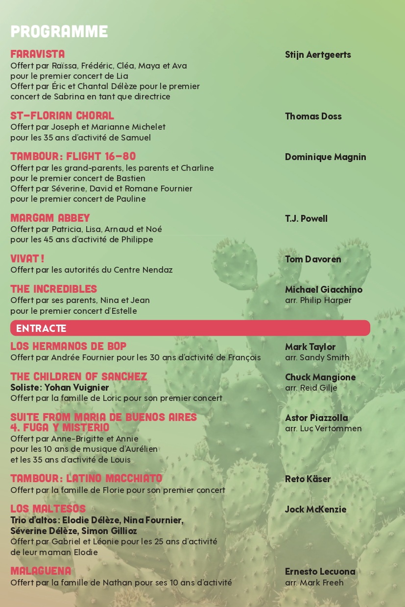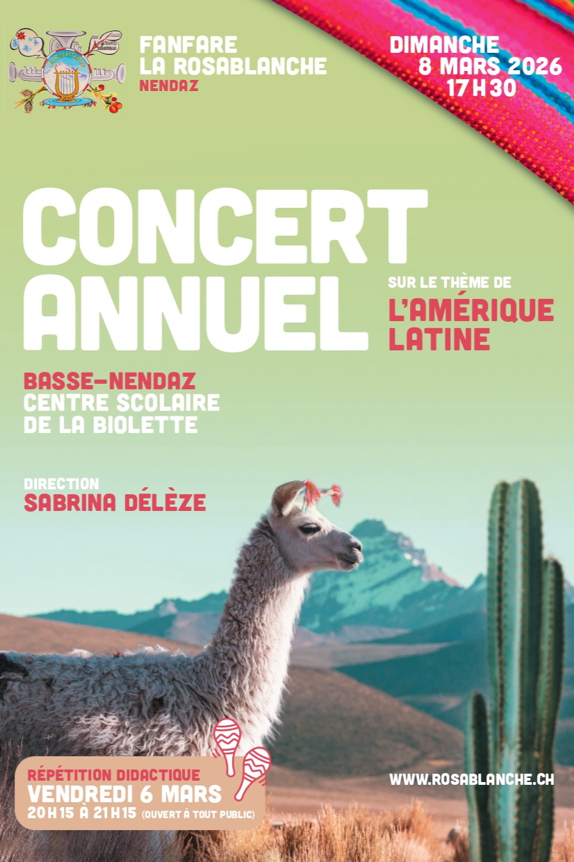 Concert Annuel 2026 Programme et infos LIEU Salle de la Biolette1996 Basse-Nendaz Google Maps RÉPÉTITION DIDACTIQUE Vendredi 6 mars 2026 20h15 à 21h15 CONCERT ANNUEL Dimanche 8 mars 2026 17h30 Télécharger le programme